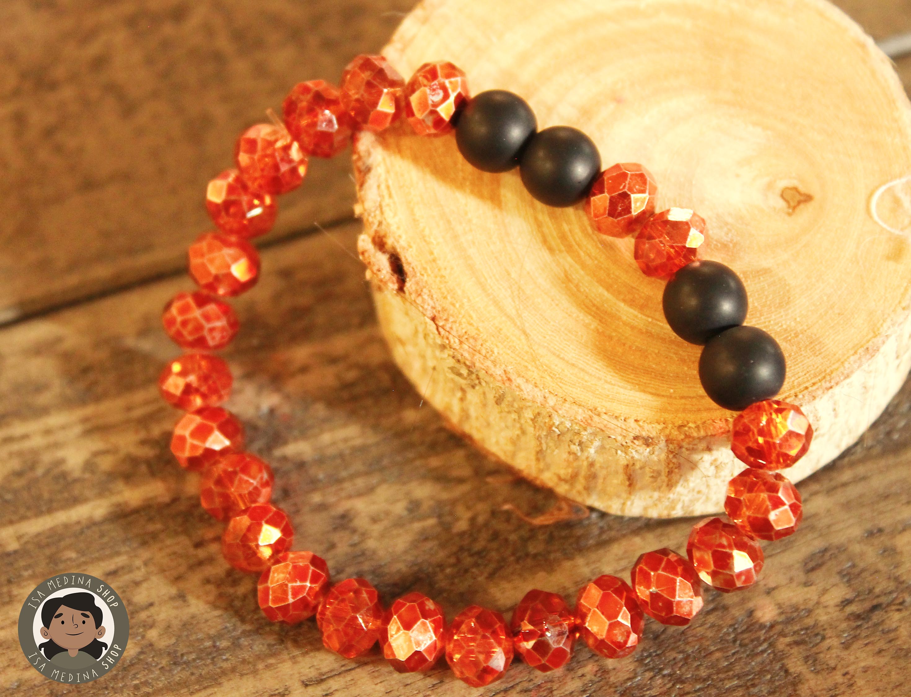 Una bonita pulsera con cristal en tono naranja, como calabaza y perlitas onix mate
