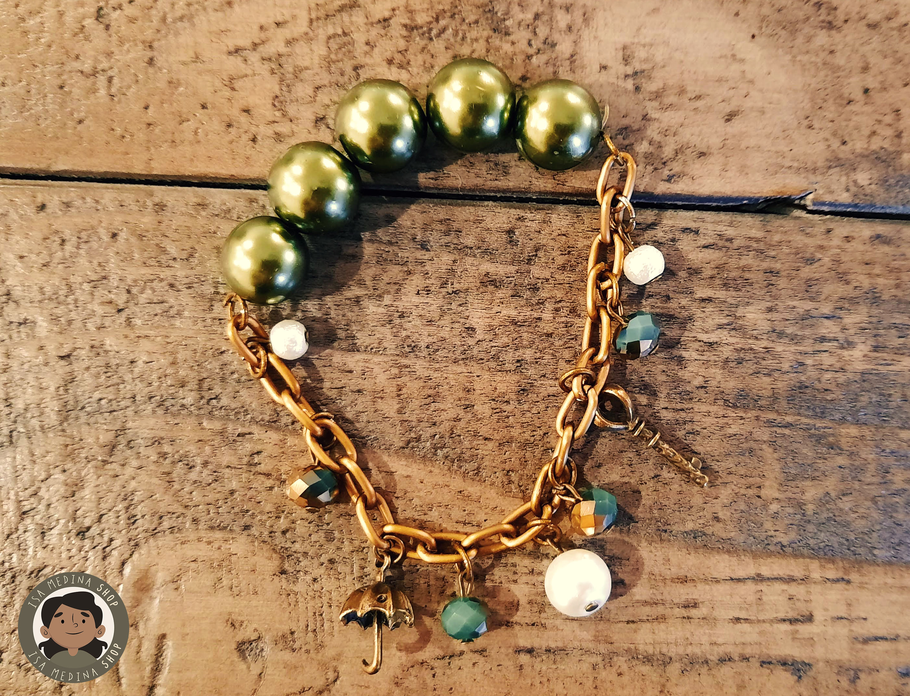 ¿Buscas un accesorio que tenga un toque vintage? ¡Esta pulsera es para ti!. Con perlas grandes en color verde y cristales facelados, de tonos verdes con bronce y además algunos dijes en tono bronce envejecido.